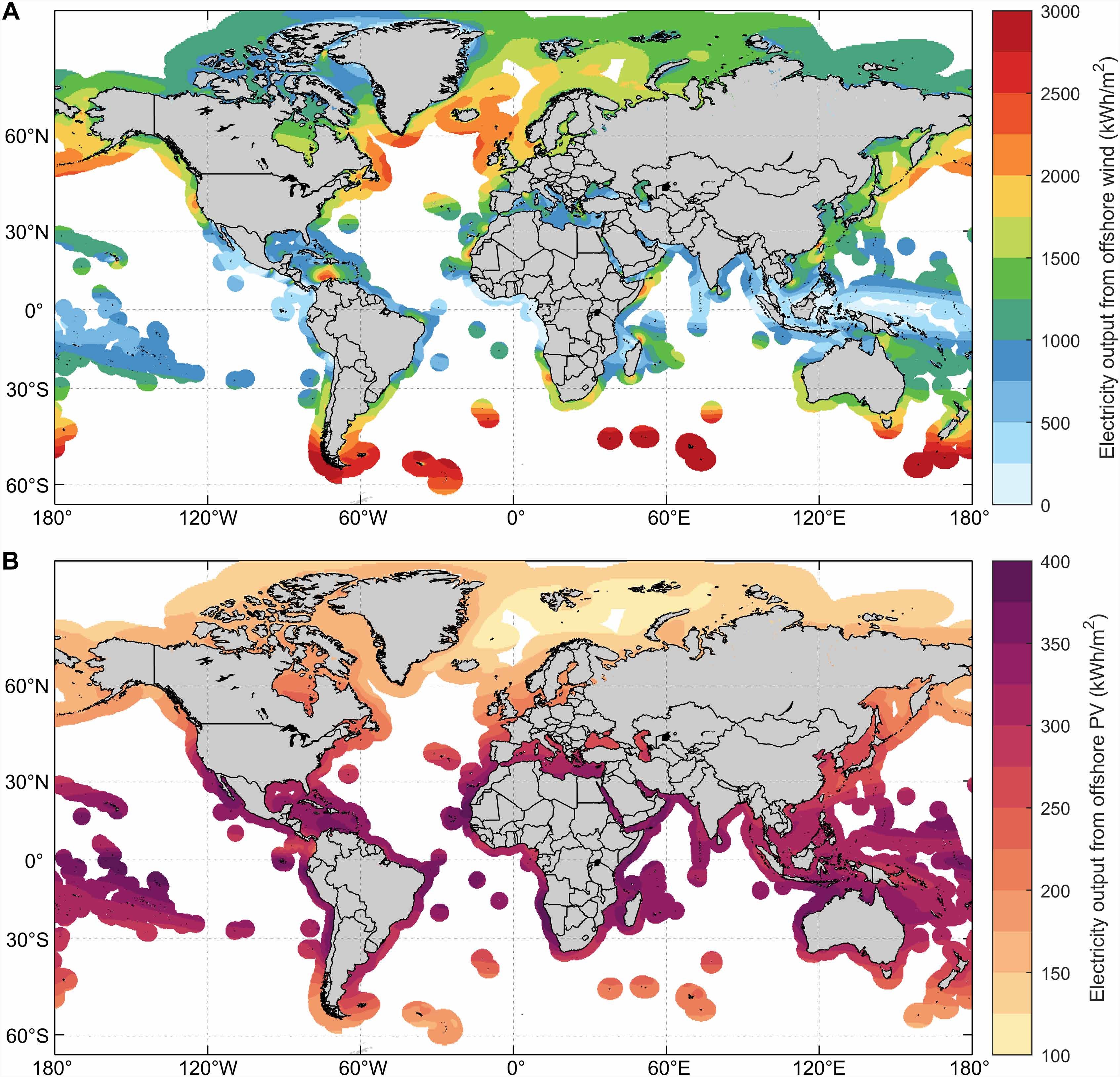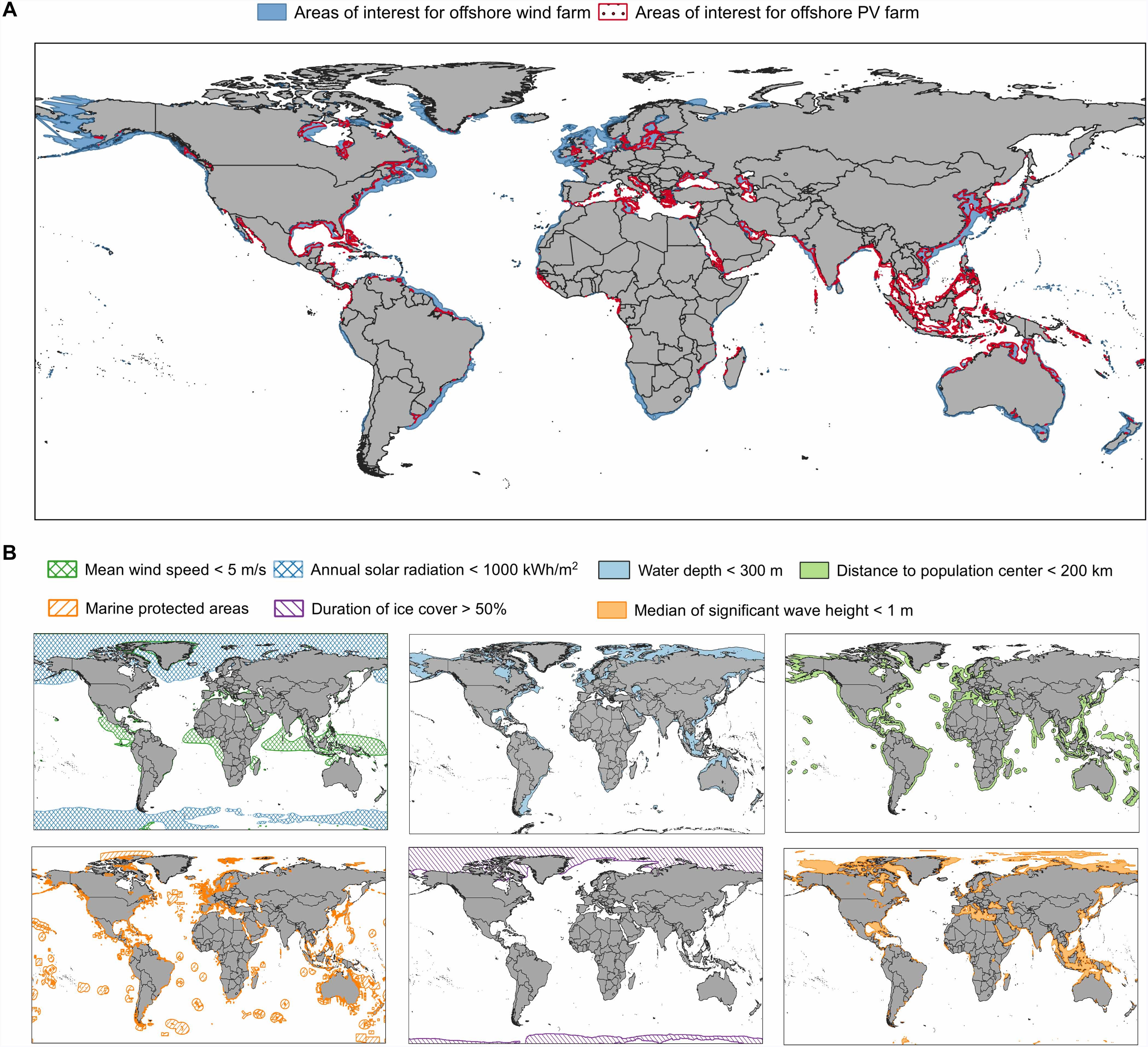 在全球碳中和的大背景下,积极推动清洁能源以加速能源生产向低碳转型已成国际共识。然而,陆上开发常面临土地供应与审批流程等限制,而资源丰富、空间广阔的海上可再生能源,尤其是风能与太阳能光伏,被视为迈向低碳未来的关键力量。尽管海上开发潜力巨大,但其资源勘测难度高、全球可用资源规模不清等问题,仍是当前领域发展的主要障碍。为评估全球海上风电与光伏的开发潜力,研究团队基于欧洲中期天气预报中心1994-2023年的气象数据,设定了严格的选址标准:筛选出平均风速≥5米/秒、年太阳辐射量≥1000 kWh/㎡的区域,并排除海洋保护区、长期海冰覆盖区,同时将范围限定在水深小于300米、距人口稠密区200公里以内的海上专属经济区。